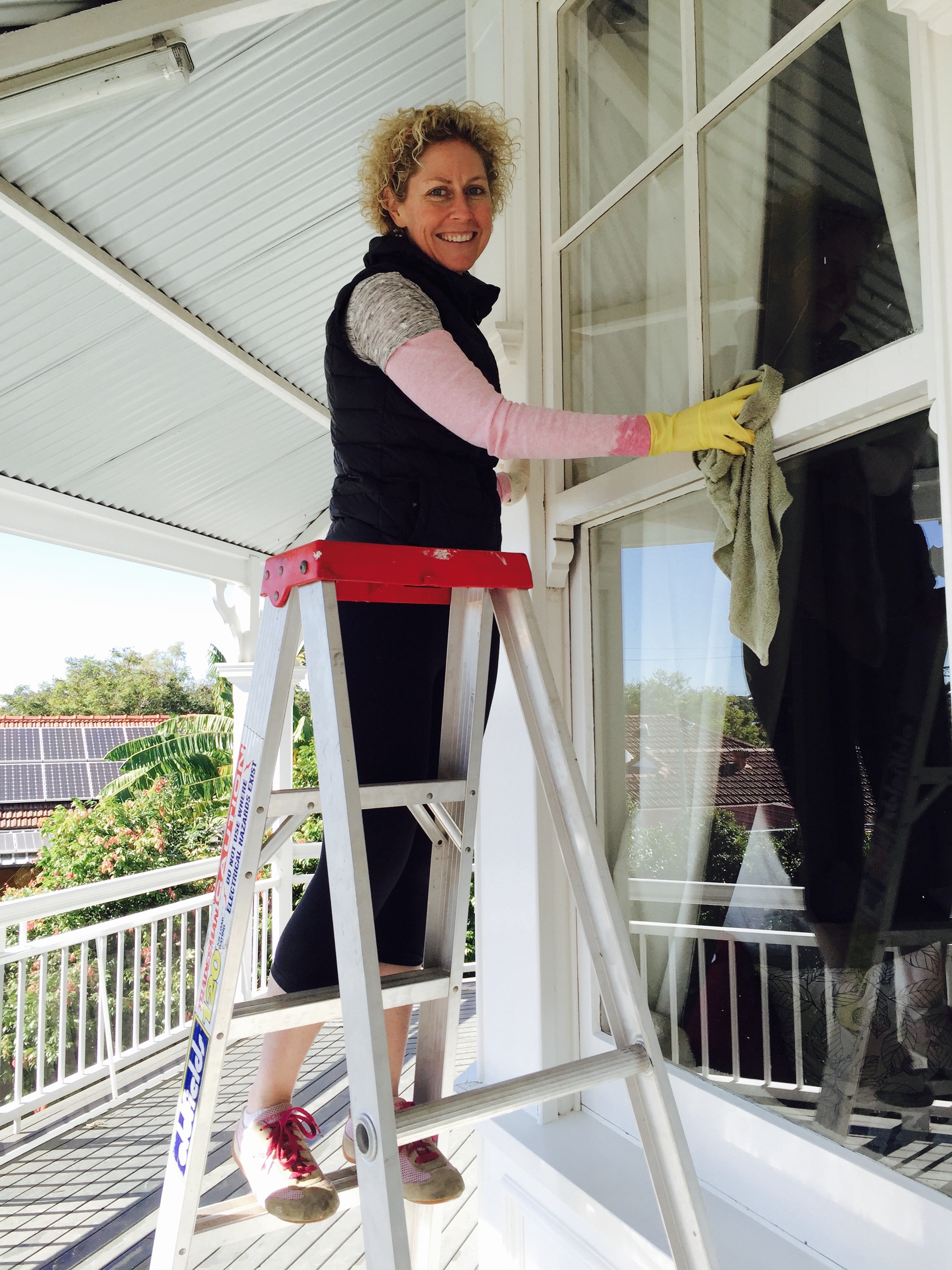 Once the house had been high-pressure water blasted, and so that the white walls didn’t dry all streaky, we were asked to wipe down all the walls from the very top to the very bottom. This required getting up and down a very tall ladder in order to reach from the 12-foot-high roofline to the verandah.